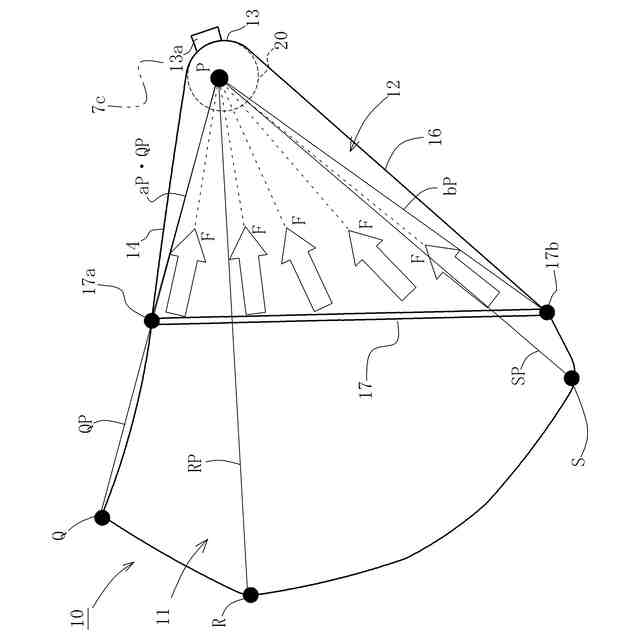 点Pはアンカー20の中心であり、取付端部113のアンカーを取付ける範囲における中心をなす取付点でもある。この点Pの位置は、最上点Qよりも上方の高い位置になっている。