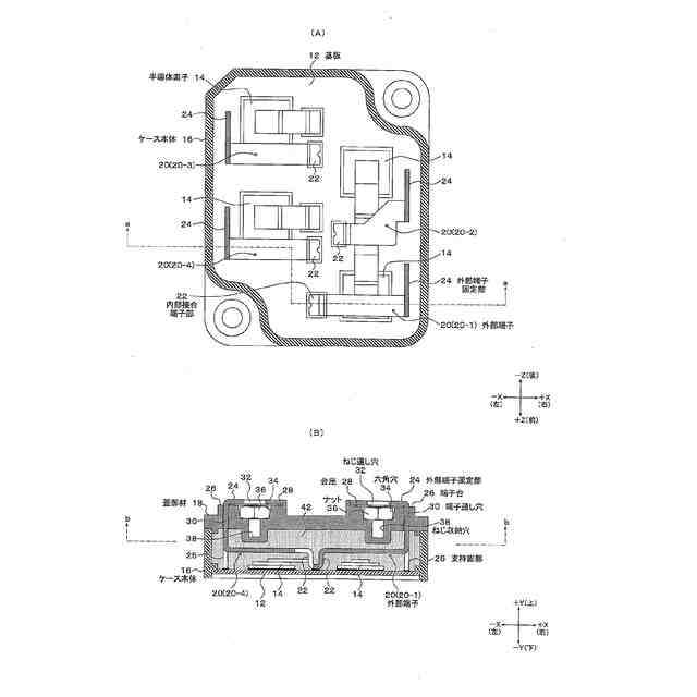 図14(A)は従来の半導体装置の一例を示す。図14(A)に示すように、従来の半導体装置100は、半導体素子を用いた半導体回路が実装された基板1012をケース本体1016の底部に収納し、ケース本体1016の上部開口には蓋部材1018が配置され、基板1012上の回路パターンと蓋部材1018の端子台1026との間に外部端子1020が配置され、外部端子1020は鋼材等の導電性の板状部材の一部を曲げ加工した形をとっている。