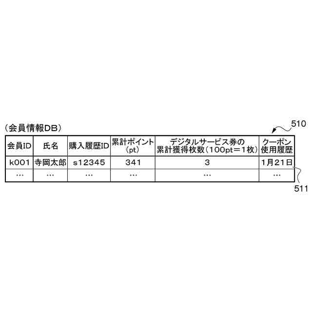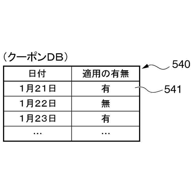 クーポンデータベースが記憶するクーポン情報の一例を示す図である。