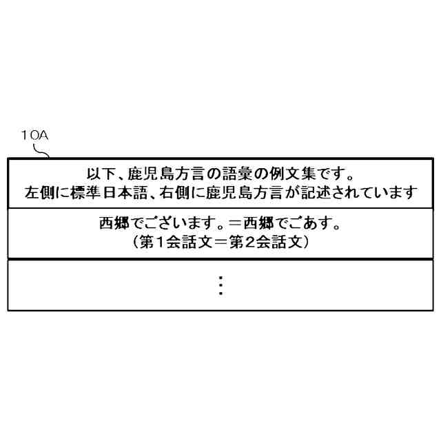 第1言語で記述された第1会話文と、前記第1言語と同族の言語に分類される方言であって、生成AIの学習用の言語資源が前記第1言語より少ない低資源言語である第2言語で記述され、前記第1会話文と意味が同じ第2会話文とを対比可能に含む対訳例文テキストデータと、