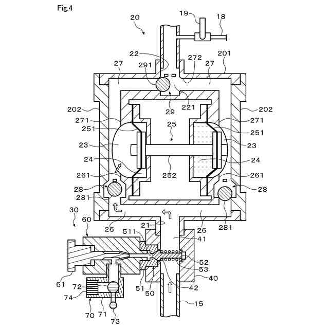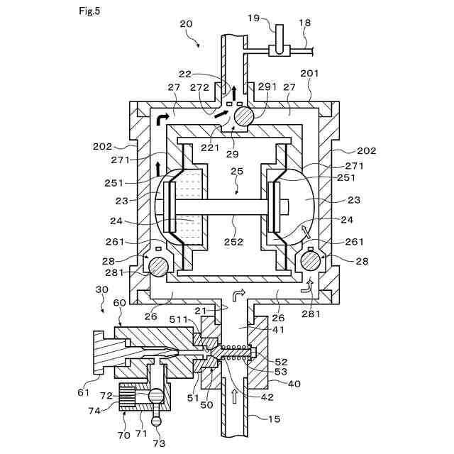 移送対象となる液体の入口及び出口と、前記入口と前記出口とを繋ぎ前記移送対象が流れる移送経路と、を有する容積式往復型のポンプ装置の前記入口側に接続され、前記移送対象の移送時に生じる負圧によって前記移送経路に外気を取り込むものであって、
