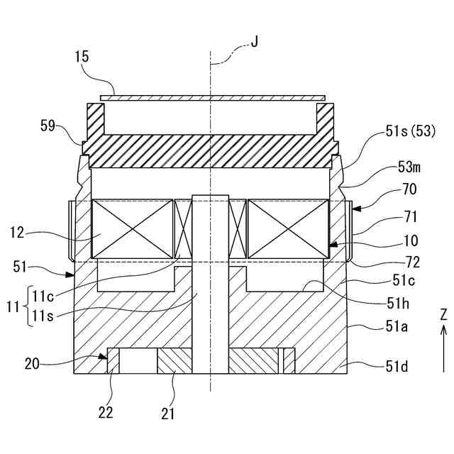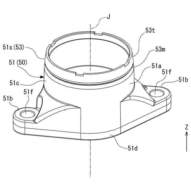 各図には、適宜、以下の実施形態の電動ポンプの中心軸線Jを示す。中心軸線Jは、仮想軸線である。以下の説明においては、中心軸線Jが延びる方向、つまり中心軸線Jの軸方向を単に「軸方向」と呼び、中心軸線Jを中心とする径方向を単に「径方向」と呼び、中心軸線Jを中心とする周方向を単に「周方向」と呼ぶ。各図においては、軸方向と平行なZ軸を示す。以下の説明においては、軸方向のうちZ軸の矢印が向く側(+Z側)を「上側」と呼び、軸方向のうちZ軸の矢印が向く側と逆側(-Z側)を「下側」と呼ぶ。以下の実施形態において、上側は「軸方向一方側」に相当し、下側は「軸方向他方側」に相当する。なお、上側および下側とは、単に各部の配置関係等を説明するための名称であり、実際の配置関係等は、これらの名称で示される配置関係等以外の配置関係等であってもよい。