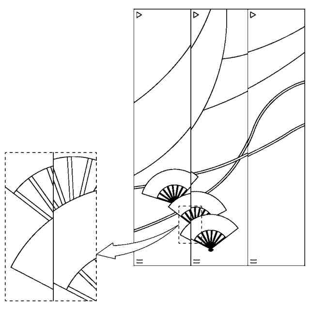 したがって、友禅染めと桶染めを併用する染め加工を行う際、たとえば、図6に示すように、友禅染めの後に桶染めを行う場合は、桶染めの型付けは生地が伸びた状態で行われ、また、桶染めの後に友禅染めを行う場合は、友禅染めの型付けは絞り加工が行われた周辺の生地が縮んだ状態で行われることになり、このように、生地が伸びたり縮んだりして基準がずれている状態で型付けが行われた場合、図7に示すように、絵羽が合わなくなる(絵羽にズレが生じる)不具合が生じ、この絵羽のズレが許容範囲を超えた場合は、適宜な修正処理を行っている。