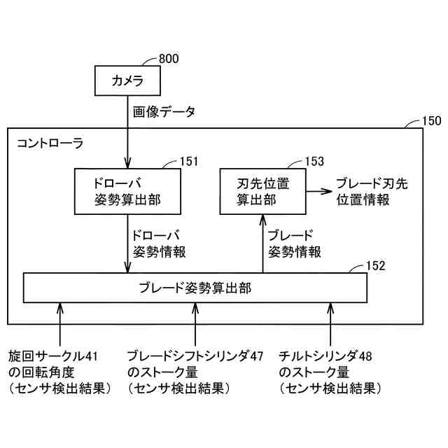 特許文献1のモータグレーダでは、複数の光学ターゲット(識別用マーカ)を別々のカメラで撮像することにより、ブレードの姿勢を求めている。これに限らず、ブレードの姿勢は、ドローバの姿勢から比較的容易に求めることができる。よって、ドローバの姿勢を算出できれば、ブレードの姿勢を求めることができる。