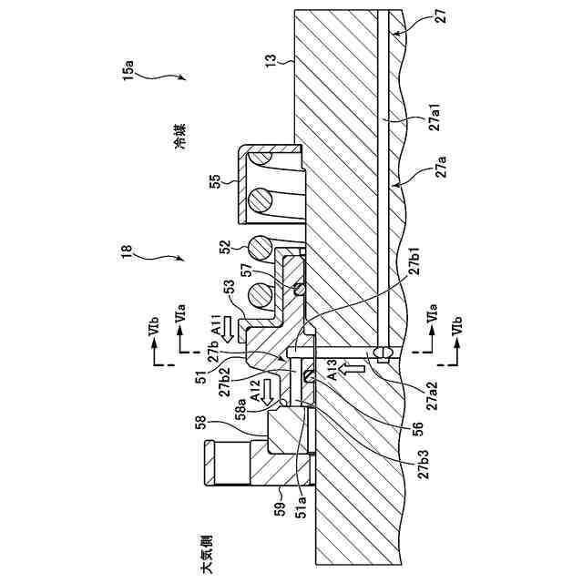 このようなシール部材によって上記した滑り軸受に適用される冷媒の漏洩を防止しようとした場合、冷媒が高圧であることから、回転環と固定環との摺動面の面圧を高める必要がある。しかしながら、摺動面の面圧を高めると、摺動面が摩擦により高温になることで、オイルのスラッジや、摺動面の焼き付きが生じる可能性がある。特に、電気自動車では、モータが高回転数で動作するため、このようなスラッジや焼き付きが生じる可能性が高くなる。この理由としては、摺動面の面圧が高いため、界面に十分な油膜を形成できないこと、及び、オイルが摺動面から受熱するため、摺動面温度を低く保てないこと、が挙げられる。