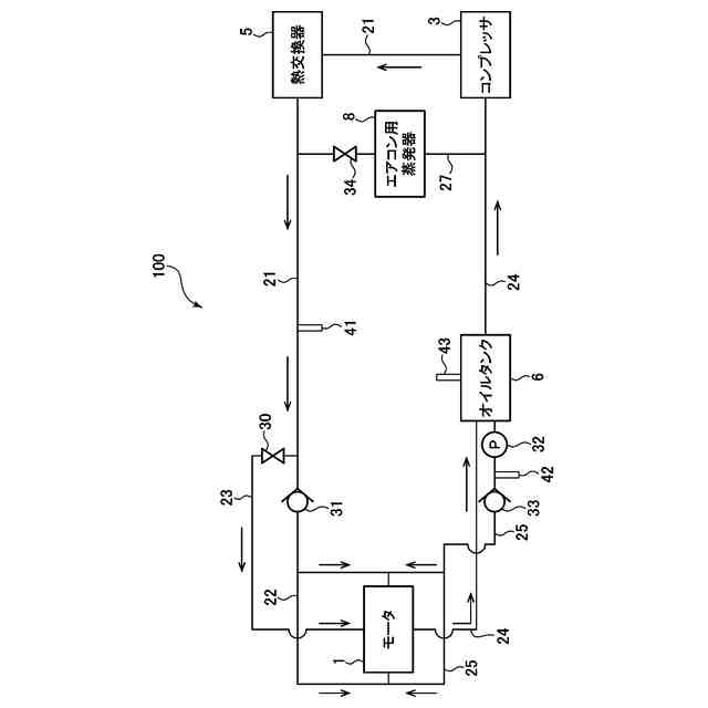 このように構成された本発明では、制御装置は、オイル含有率調整機構を制御することにより、モータ回転数センサによって検出されたモータ回転数に応じて、滑り軸受を潤滑するための冷媒中のオイル含有率(冷媒の粘度に対応する)を適宜変化させることができる。具体的には、制御装置は、モータ回転数が低くなるほど、オイル含有率が大きくなるように、オイル含有率調整機構を制御する。これにより、モータ回転数が比較的低いときに、十分な量のオイルを含有する冷媒を滑り軸受に供給して、滑り軸受の負荷能力を確保することができる。他方で、制御装置は、モータ回転数が高くなるほど、オイル含有率が小さくなるように、オイル含有率調整機構を制御する。これにより、モータ回転数が比較的高いときには、含有するオイルが低減された冷媒を滑り軸受に供給して、滑り軸受でのオイルによる摩擦(潤滑抵抗)を低下させることができる。以上より、本発明によれば、モータの運転状況に応じて、滑り軸受の負荷能力の確保及び滑り軸受の摩擦低減(潤滑抵抗の低減)の両方を実現可能となる。