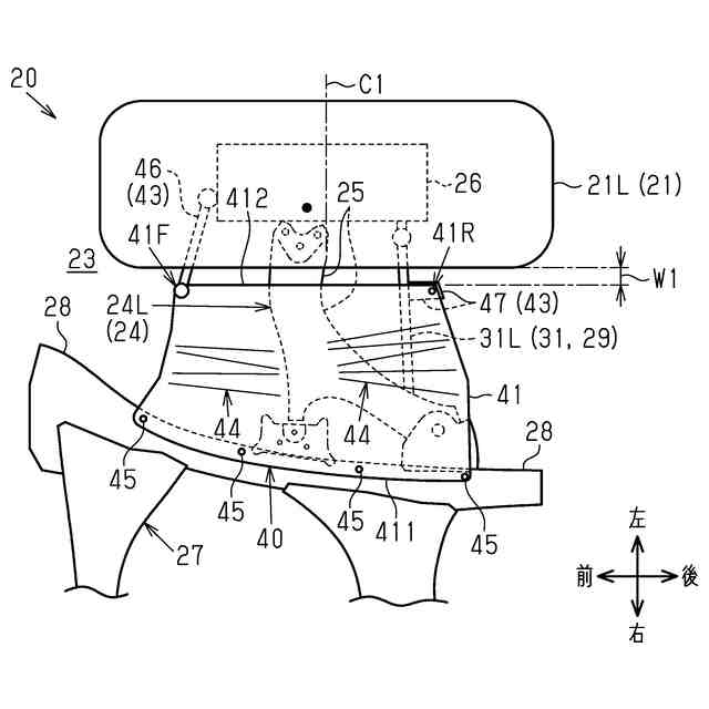 車両20は、右前輪21R、左前輪21L、右後輪22R、および左後輪22Lを各別に収容する4つのタイヤハウス23を備えている。各タイヤハウス23は、下側に向けて開口するように、車両20の下部に設けられている。