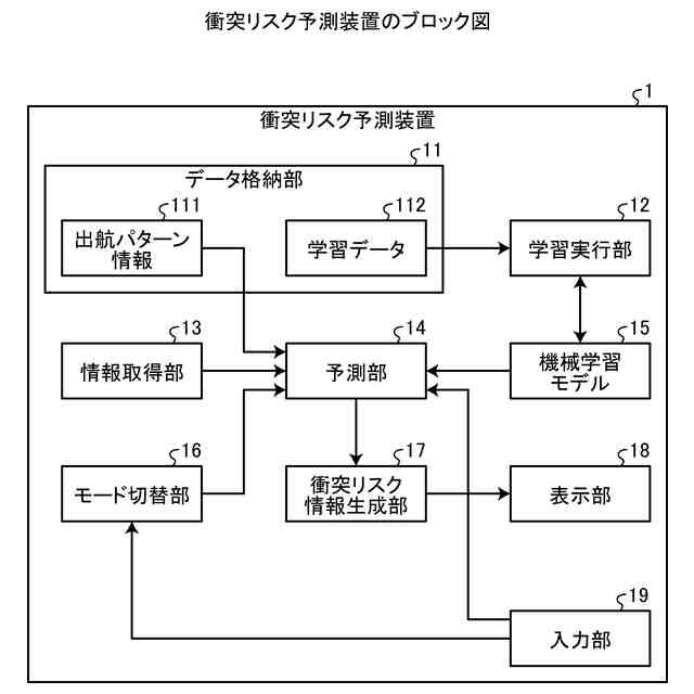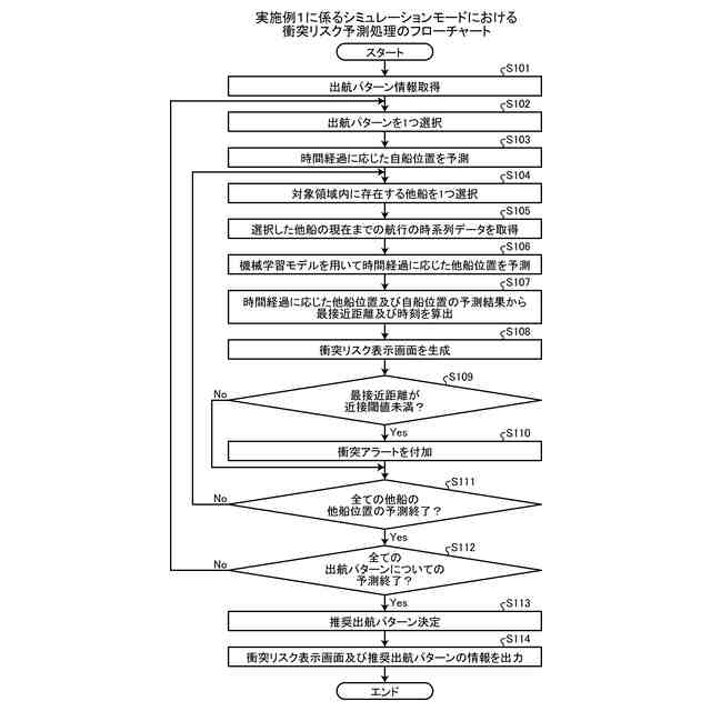 【解決手段】所定領域における過去の船舶の航行情報の時系列データを用いて機械学習モデルに学習させ、所定領域に存在する他船の航行情報の現在までの時系列データを基に、学習済みの機械学習モデルを用いて、時間経過に応じた他船位置を予測し、所定領域における自船の現在の航行情報を基に、時間経過に応じた自船位置を予測し、時間経過に応じた他船位置及び自船位置の予測結果を基に衝突リスク情報を生成し、生成した衝突リスク情報を通知する。