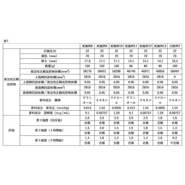 そこで本発明は、香り立ちが良好で、かつ香りの持続性を高めた発泡性圧縮成形物を提供すること、および、発泡性圧縮成形物の香りの持続性を向上させる方法を提供することを目的とする。なお、本発明では香り立ちとは、発泡性圧縮成形物を水等に溶解した直後に、香りが拡散し、香りを感じることを意味する。