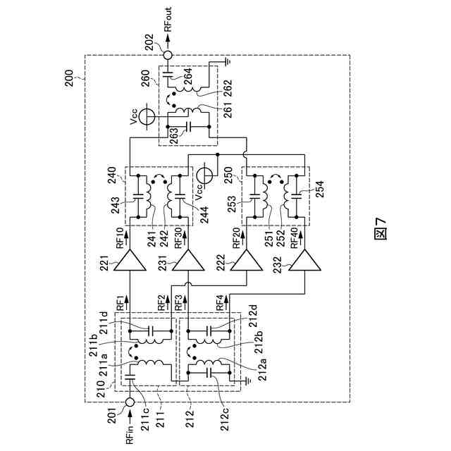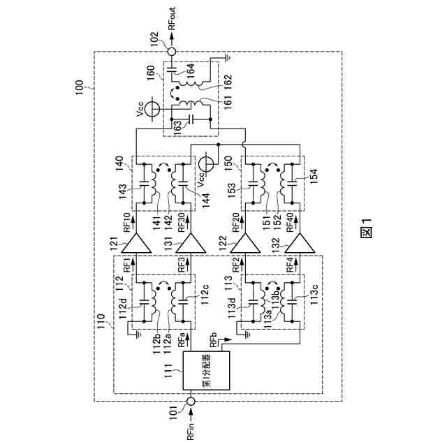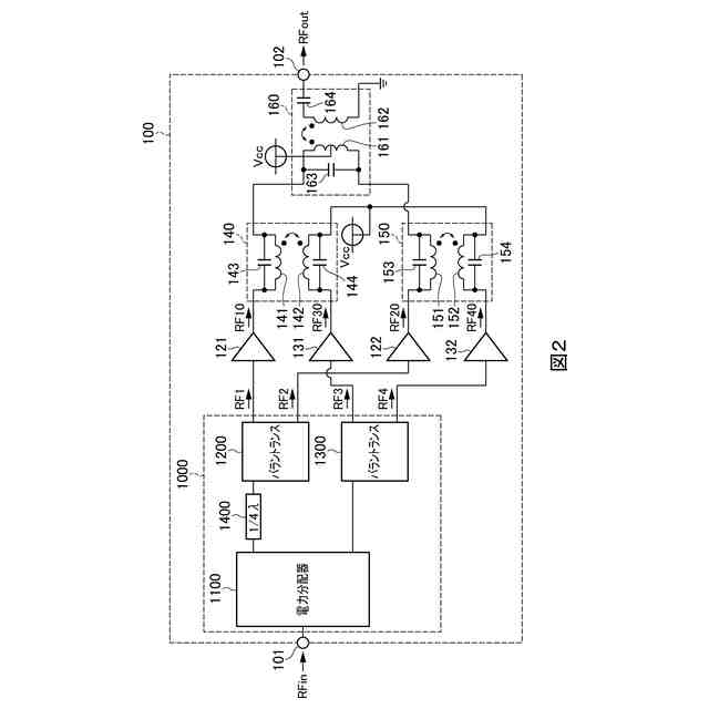 記第3インダクタと並列に接続されるキャパシタと、前記第4インダクタと並列に接続されるキャパシタと、を含む第2分配器であって、前記第4インダクタの一端から第3入力信号が分配され、前記第4インダクタの他端から第4入力信号が分配される第2分配器と、前記第1入力信号を増幅して第1出力信号を出力する第1キャリアアンプと、前記第1キャリアアンプと差動対を構成し、前記第2入力信号を増幅して第2出力信号を出力する第2キャリアアンプと、前記第3入力信号を増幅して第3出力信号を出力する第1ピークアンプと、前記第1ピークアンプと差動対を構成し、前記第4入力信号を増幅して第4出力信号を出力する第2ピークアンプと、前記第1出力信号と、前記第2出力信号と、前記第3出力信号と、前記第4出力信号と、を合成する合成回路と、を備える。
