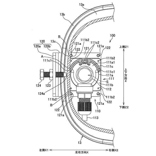 また、前記保持部は、前記ホーンの外側に位置する第一片部と、前記第一片部を貫通して延び且つ前記ホーンの外面を押圧する押圧部材と、を備え、前記押圧部材の押圧力により、前記センサハウジングが前記ホーンに固定されることが好ましい。