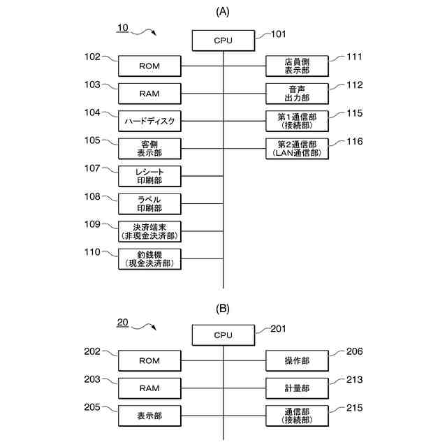 荷物引受装置10と計量装置20とは通信可能に接続されている。荷物引受装置10は計量装置20以外の装置と通信しなくてもよいが、本実施形態では、荷物引受装置10は計量装置20以外の装置とも通信するものとする。具体的には、荷物引受装置10は、店舗T内に敷設されたLANに接続され、LAN上に設置された他の装置(他の荷物引受装置10、管理装置(非図示)等)と通信可能である。管理装置(非図示)は、例えば、荷物引受装置10の釣り銭の状況(ニアエンド、ニアフル)や、レシート用紙やラベルの状況(ニアエンド)を監視等する。また、LAN上には、店舗外の装置(例えば、本部(本社)やデータセンタ等に設置された装置)と通信可能な店舗サーバを設置してもよい。荷物引受装置10は、店舗サーバを介して店舗外の装置と通信してもよい。