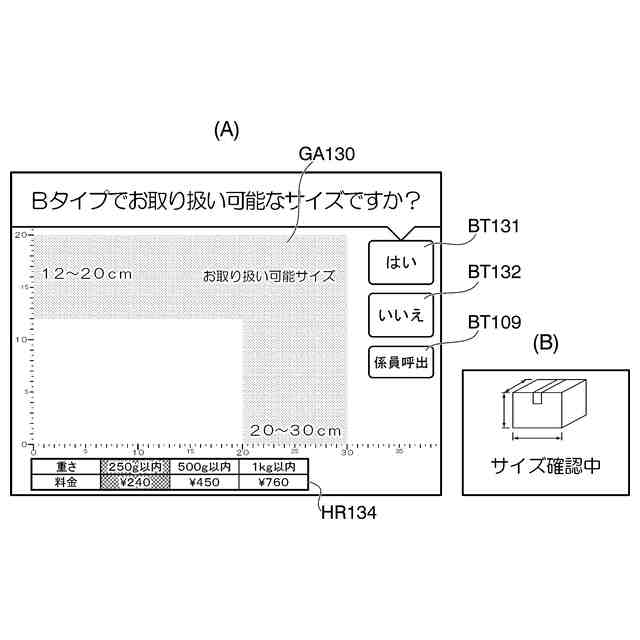 以下、本発明の実施形態について図面を参照して説明する。図1は、荷物引受装置10、計量装置20の設置例を示す図である。図1(A)は、荷物引受装置10等を客(荷物の配送依頼者)側から見た斜視図である。図1(B)は、荷物引受装置10等を店員(職員、従業員)側から見た斜視図である。図1に示すように、客側から見て荷物引受装置10の右側には荷物を投入可能な投入ボックス30が設置されている。投入ボックス30の上面には計量装置20が設置されている。なお、荷物引受装置10と計量装置20とを合わせて荷物引受システムと称してもよい。