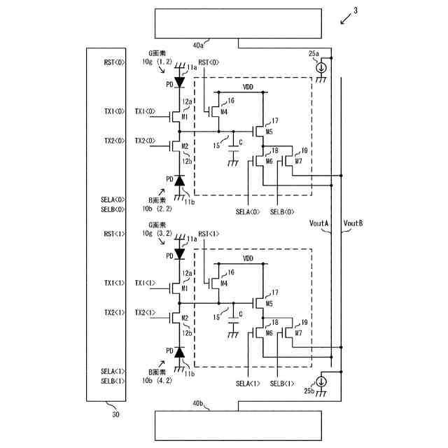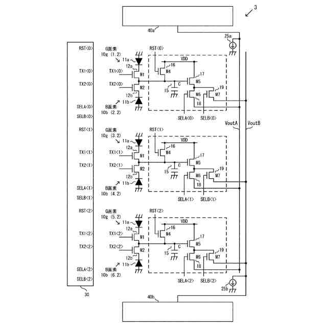 【解決手段】撮像素子3は、AF画素(13a)、AF画素(13b)、撮像画素(例えば10r)と撮像画素(例えば10g)が列方向に沿って配置される画素部100と、第1読み出し部40aに接続する第1信号線VoutAと、第2読み出し部40bに接続する第2信号線VoutBと、画素からの信号の出力を制御する第1制御と第2制御を行う垂直制御部30とを備え、第1制御では、第1信号線VoutAと第2信号線VoutBとのうちいずれか一方の信号線に出力されるようにAF画素(13a)とAF画素(13b)とを制御し、第2制御では、第1信号線VoutAと第2信号線VoutBとのうち異なる信号線に出力されるように撮像画素(例えば10r)と撮像画素(例えば10g)とを制御する。