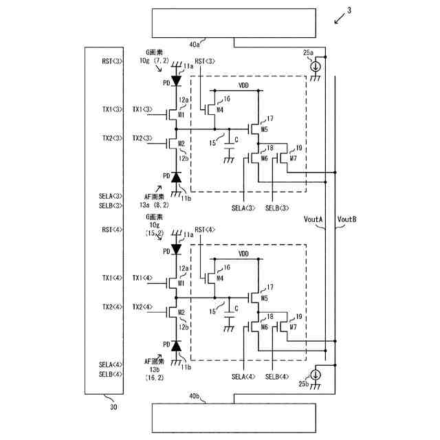 撮像素子3は、撮像画素とAF画素(焦点検出画素)とを有する。撮像画素は、画像生成に用いる信号(撮像信号)を出力する。AF画素は、焦点検出に用いる信号(焦点検出信号)を出力する。後述するが、AF画素は、撮像画素の一部に置換して配置され、撮像素子3の撮像面のほぼ全面に分散して配置される。なお、以下の説明では、単に画素と称する場合は、撮像画素およびAF画素のいずれか一方または両方を指す。