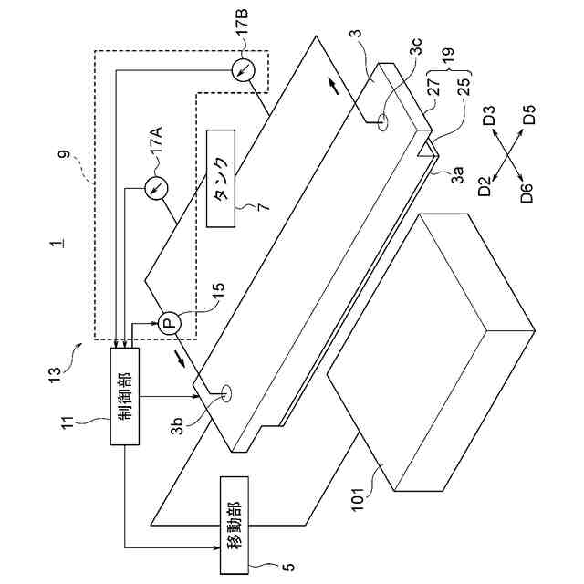 吐出装置1は、例えば、インクジェットプリンタのように、ヘッド3の吐出面3aから対象物101に向けて液滴を吐出することによって対象物101の表面に液体を付着させる装置として構成されている。なお、吐出面3aは、鉛直方向に対していずれの方向に面していてもよいが、以下の説明では、便宜上、吐出面3aが面する方向を下方として、上面又は下面等の語を用いることがある。
