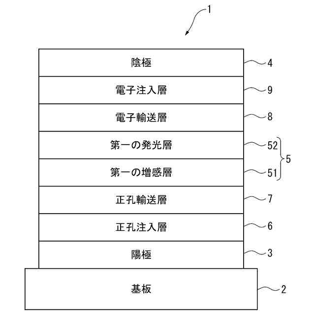 【解決手段】陽極(3)と、陰極(4)と、陽極(3)及び陰極(4)の間に配置された発光領域(5)を有し、発光領域(5)は、第一の増感層(51)及び第一の発光層(52)を含み、第一の増感層(51)は、第一のホスト材料と、第一の増感材とを含有し、第一の発光層(52)は、第二のホスト材料と、第一の発光性化合物とを含有し、第一のホスト材料と第二のホスト材料とは、互いに異なり、第一の増感材と第一の発光性化合物とは、互いに異なり、第一の増感材の最低励起一重項エネルギーS