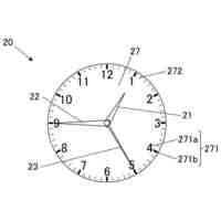 (a)は、第1実施形態の時計を示す正面図であり、(b)は、(a)に示す時計の裏面図であり、(c)は、(a)に示す時計のc-c線に沿う断面図である。