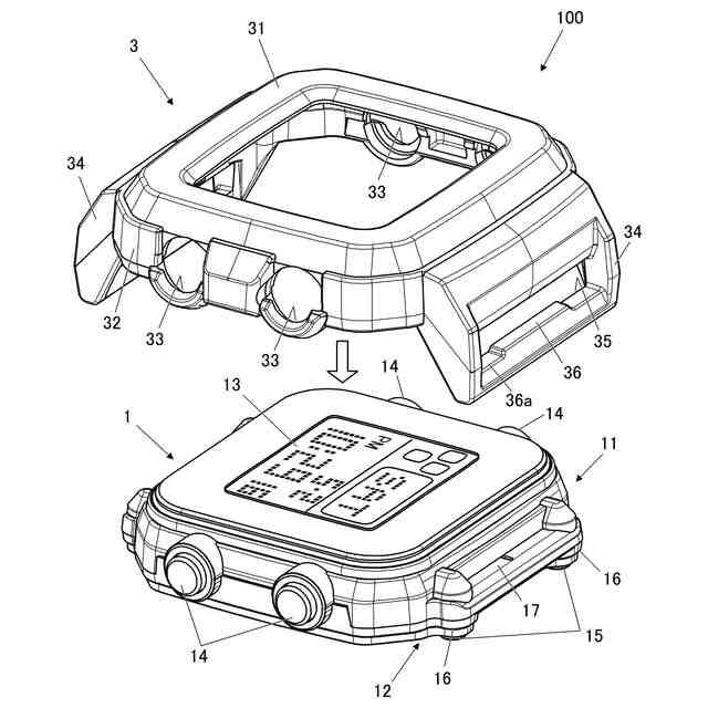 図1及び図14等に示すように、本実施形態に係る時計は、電子時計本体(以下において、単に「時計本体1」とする)と、時計本体1に対して装着可能な外装部材と、を備えている。実施形態において、外装部材は、時計本体1に対して選択的に装着される第1部材又は第2部材の何れかである。第1部材は、バンド5を取り付けることが可能なベゼル3であり、第2部材は外装ケース7であって、ベゼル3及び外装ケース7は、時計本体1に対して着脱自在となっている。以下において、時計本体1にベゼル3が装着された状態を第1の実施形態の「時計100」として説明し、時計本体1に外装ケース7が装着された状態を第2の実施形態の「時計200」として説明する。なお、第1の実施形態、第2の実施形態とも時計本体1の構成は同じである。このため、まず第1の実施形態及び第2の実施形態に共通する構成として、まず時計本体1について説明する。