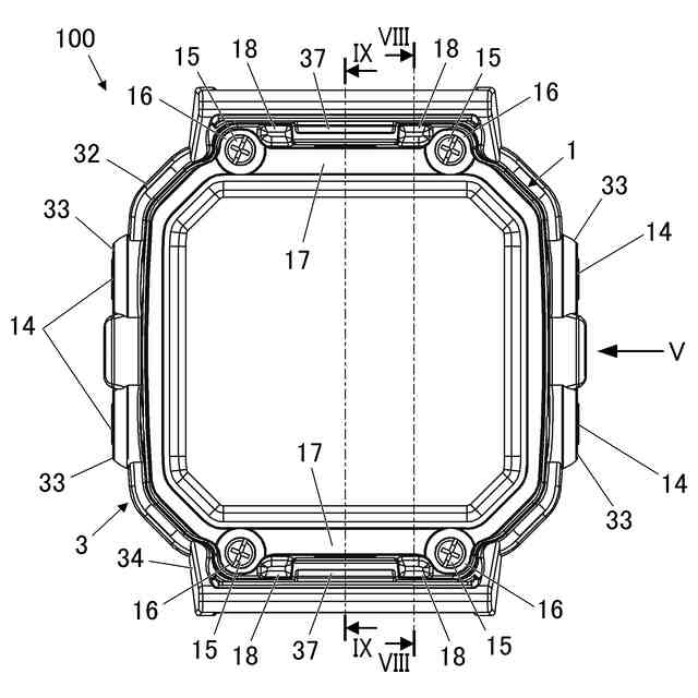 図4における矢視V方向から見た外装部材が装着された時計本体の側面図である。