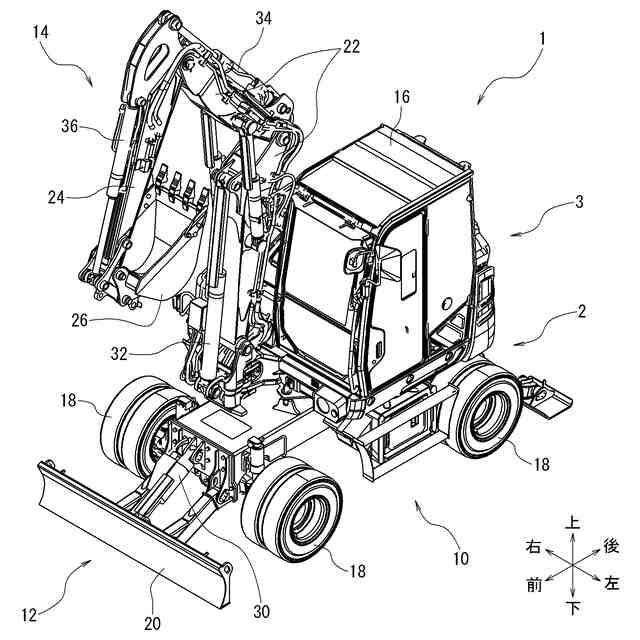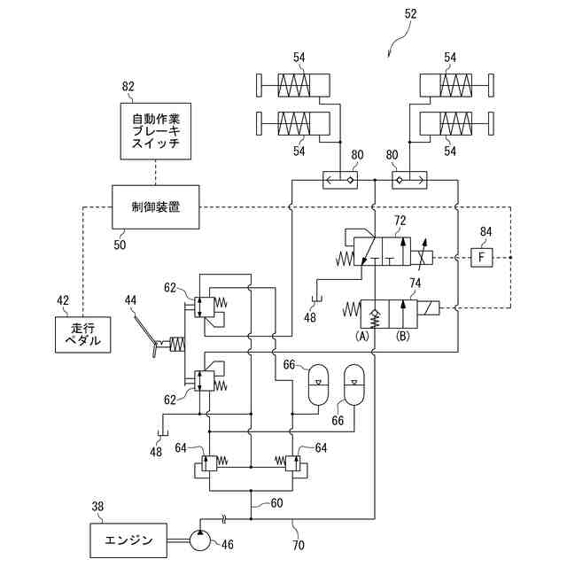 ホイール式油圧ショベルは、油圧により作動するブレーキ装置を搭載している。ブレーキ装置は、通常、走行中の車両を減速もしくは停止させるサービスブレーキとして使用されるが、掘削等の作業時に車両の停止状態を強固に保持する作業ブレーキとして使用される場合がある(これを「作業ブレーキを掛ける」等と表現する場合がある)。