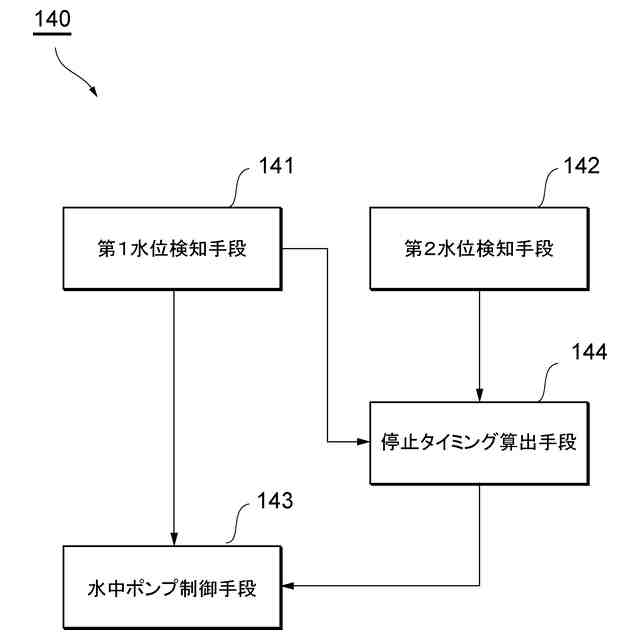 【解決手段】水位検知部材130は、第1水位を検知する第1検知部131と、第2水位を検知する第2検知部132と、を含み、水位検知部材130が水中ポンプ本体110に設置された状態での第1検知部131と第2検知部132との鉛直方向の第1距離が、水位検知部材130の設置位置に応じて異なるように構成されており、水中ポンプ制御部140は、第1検知部131によって第1水位が検知されることに基づいて、水中ポンプ本体110の運転を開始し、第1検知部によって第1水位が検知されてから第2検知部132によって第2水位が検知されるまでの時間を計測し、計測した時間に応じた停止タイミングで、水中ポンプ本体110の運転を停止する。