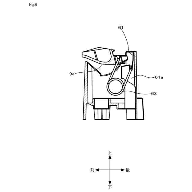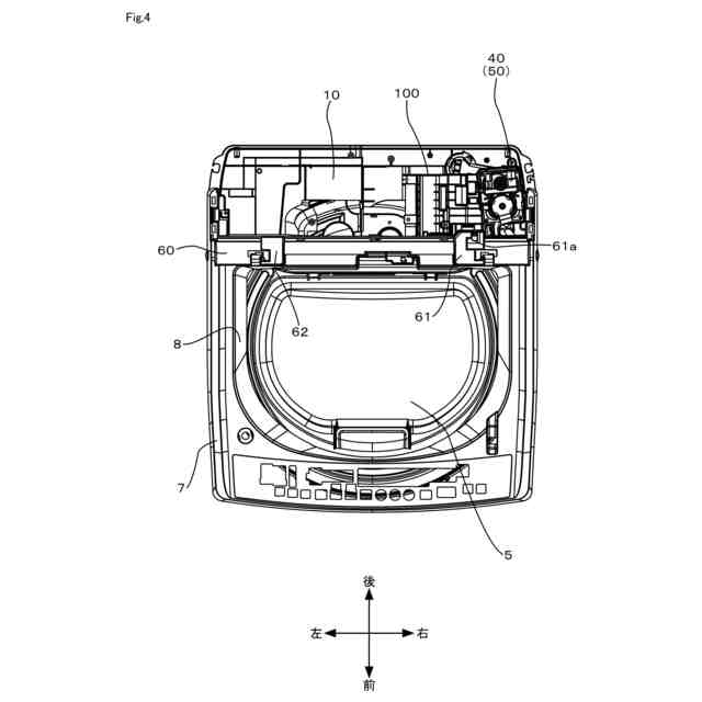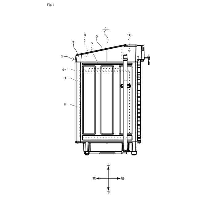 水槽3は、衣類が収容される衣類処理槽の一例であり、上部が開放した有底円筒状をなしている。水槽3の上面開放部には、水槽カバー4が設けられている。水槽カバー4には、内蓋5が上下方向に回動可能に設けられている。水槽3の内部には、上部が開放した有底円筒状の図示しない回転槽が縦軸回りに回転可能に備えられている。また、この回転槽の底部には、当該回転槽内の衣類や水槽3内の水を撹拌するための図示しないパルセータが縦軸回りに回転可能に備えられている。
