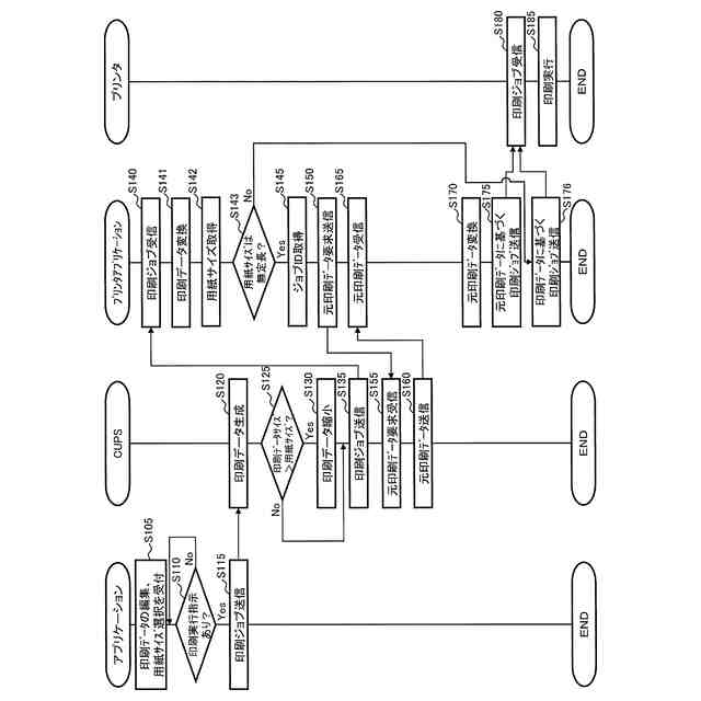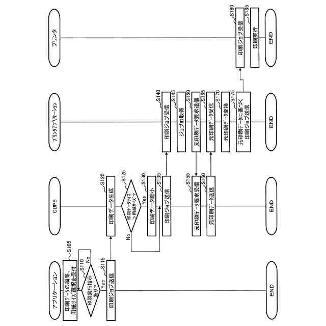 【解決手段】プリンタにより協働して実行される制御手段であって、プリンタアプリケーションは、CUPSで生成されて出力された印刷データを取得するステップS140と、被印刷用紙が無定長である可能性がある場合に、ステップS140における取得を契機に、印刷データの送信要求をCUPSに向けて出力するステップS150と、送信要求に対応したCUPSからの元印刷データを取得するステップS165と、ステップS165で取得した元印刷データに基づく印刷ジョブを、プリンタへ向けて送信するステップS175と、を実行させる。