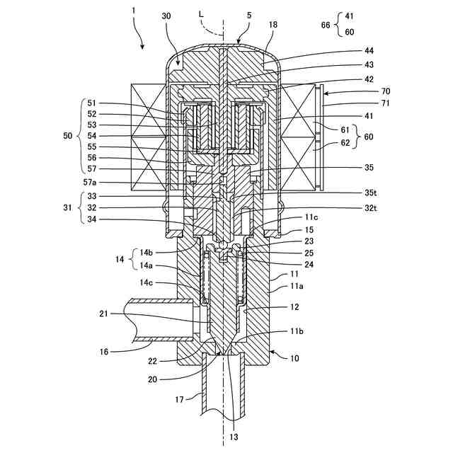ステッピングモーターにパルスが入力されるとローターが回転する。具体的には、ステーターのコイルにパルスに応じた駆動電流が供給されるとローターが回転する。ローターの回転は、歯車機構で減速され、駆動軸に伝わる。駆動軸が回転されると、駆動軸は送りねじ作用によって移動する。ローターが閉方向に回転すると、駆動軸が弁体を押し、弁体が弁口に近づく。ローターが開方向に回転すると、駆動軸が弁口から離れ、開弁ばねが弁体を押し、弁体が弁口から離れる。