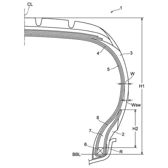 【解決手段】サイドウォール部が、再生カーボンブラックを含むゴム組成物で構成された少なくとも一つのタイヤ部材を含むものであり、前記サイドウォール部を構成するサイドウォールゴム3のタイヤ最大幅位置における厚み(mm)をW