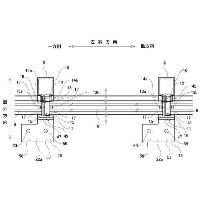 ルーバ2は、カーテンウォール1と対向する屋内側壁部32と、ナット28及び保持金具16を収容可能な収容部30と、挿通部31とを有する。保持金具16は、ナット28を回転不能に保持する1対の保持板部82と、1対の保持板部82の基端部同士を連結した連結板部83とを有する。ナット28により連結板部83を押圧し、1対の保持板部82の基端部を屋内側壁部32の内側面に押し付けることで、1対の保持板部82を互いの先端部同士が近づく方向に変形させ、1対の保持板部82によりナット28を挟持する。