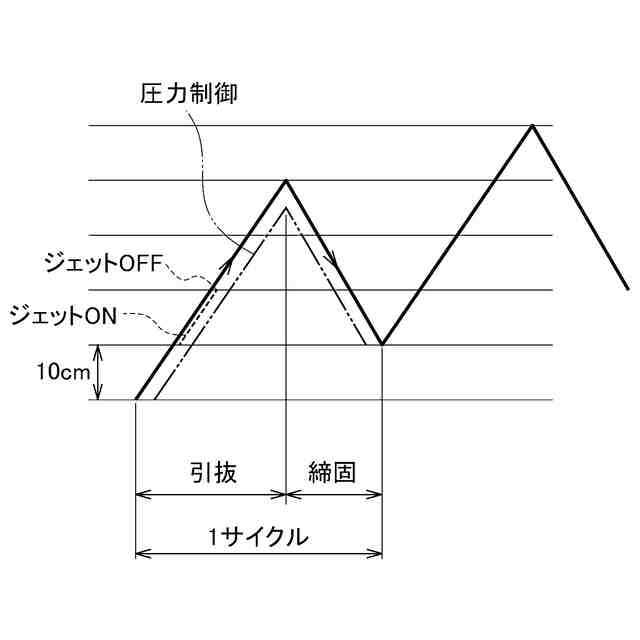 締固め杭造成装置を用いた砂杭打設によるケーシングパイプの引抜及び締固のタイミングについて説明するための図である。