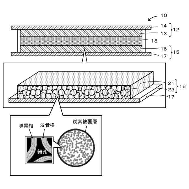 シリコン負極は、現在実用化されている黒鉛負極と比べて10倍以上の理論容量を持つが、充放電時の膨張収縮が大きいためサイクル特性に劣るという欠点がある。特許文献1の多孔質シリコン材料では、AlやCrなどを含むものとして、その強度を高め、充放電特性の低下をより抑制することができるが、まだ十分でなく更なる改良が望まれていた。