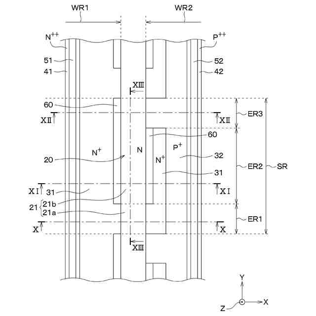 型とされ、第2凸部用第1部位を挟んで第1凸部用第1部位と反対側に配置され、第2凸部用第1部位および第1凸部用第2部位と接続されている。第2スラブ部は、コア部のP型よりも不純物濃度が高いP