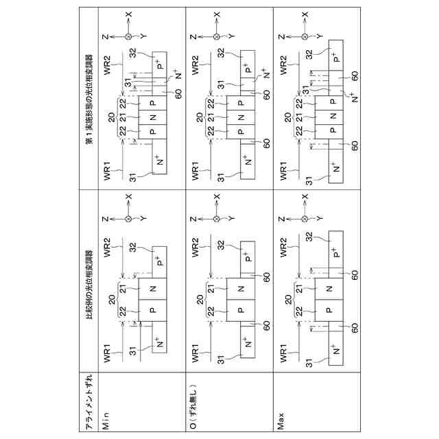 【解決手段】コア部20と、コア部20を挟んで配置され、厚さ方向の長さがコア部20よりも短くされたスラブ部31、32とを備える。コア部20は、第1導電型とされた第1凸部21と、第2導電型とされた第2凸部22とを有し、第1凸部21および第2凸部22は、PN接合を構成する状態で配置され、スラブ部31、32は、イオン注入層で構成され、第1導電型とされて第1凸部21と電気的に接続される第1スラブ部31と、第2導電型とされて第2凸部と電気的に接続される第2スラブ部32と、を有し、コア部20とPN接合を構成する部分を含むように配置され、スラブ部31、32とコア部20との間にPN接合が構成される領域ER2では、コア部20におけるスラブ部31、32側の両側の部分に第2凸部22が配置され、コア部20が第1スラブ部31で挟まれるようにする。