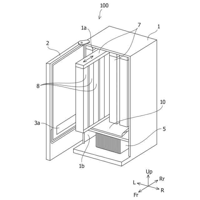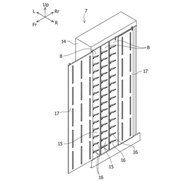 以下、本発明の実施形態について、図面を参照しながら詳細に説明する。本発明の実施形態による自動販売機は、商品棚を有する複数の商品ラックが水平方向(本実施形態においては前後方向)に並べられた自動販売機である。