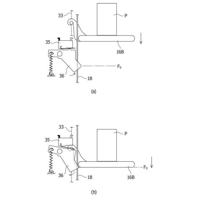 本発明の第一実施形態による自動販売機の商品ラック機構に組み込んだ商品棚検知スイッチの動作を示す図であり、(a)は商品棚が下降途中にある状態を示す図であり、(b)は商品棚が販売待機位置に配置された状態を示す図である。