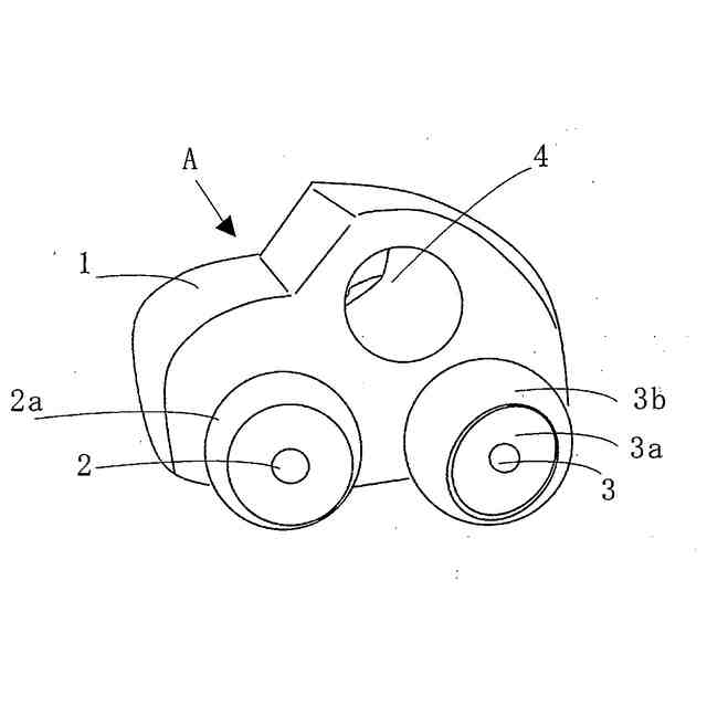 本発明の実施例1を図面に基づいて説明する。なお、本発明の実施例として自動車の玩具で説明する。玩具Aは、窓4を配した自動車の形をした車台1を備えている。車台1の側面には丸状の前側車軸穴1aと長孔形状の後側車軸穴1bが形成されている(図1図5参照)。そして前側車軸穴1aには、丸い棒状の前側車軸2が挿通されるとともに、その左右には前側車輪2a、2aが固定されている。また、後側車軸穴1bには、丸い棒状の後側車軸3が挿通されるとともに、その左右には、後側車輪3a、3aが固定されている(図4、図5参照)。そして、この後側車軸3の左右方向の中心線部Bに突部(歯車)8が固定されている(図3参照)。なお、前側車軸2、および後側車軸3は、車台1に形成された前側車軸穴1aと後側車軸穴1bに対して回動可能とされている。そして、後輪車軸3は、この長孔形状の後側車軸穴1b内にて回動するとともに前後方向にスライド可能となっている(図1図4参照)。