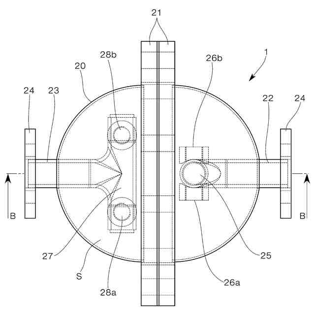 前記入口開口部に連通する入口側の前記配管の軸線と、前記出口開口部に連通する出口側の前記配管の軸線が、球形の前記内部空間の一中心軸線と一致するように配置されていることを特徴としている。
