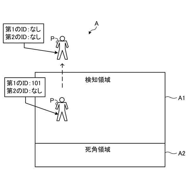前記第2のIDを付与された前記検知対象物が前記死角領域から前記検知領域に再侵入したことを画像認識によって検知すると、前記第2のIDを付与された前記検知対象物の前記第1のIDを保持したまま前記第2のIDを削除する