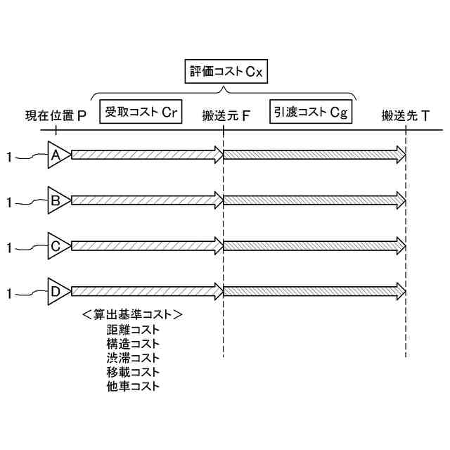 前記搬送車の移動経路に存在する他の前記搬送車の台数が多くなるに従って大きくなる他車コストと、
