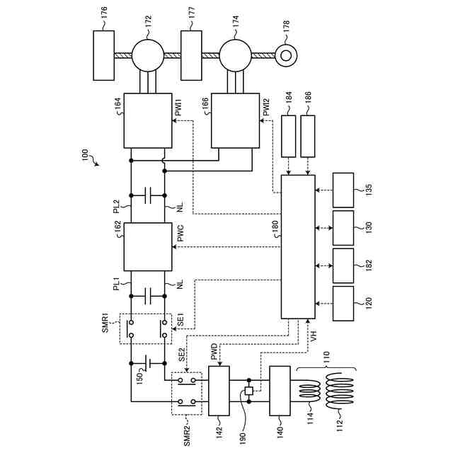 図1は、実施形態に係る非接触充電制御装置が適用される車両給電システム10の全体構成図である。実施形態に係る車両給電システム10は、車両100と車両外部に設けられる給電設備200とを備える。車両100は、受電ユニット110、カメラ120、通信部130、ハイトセンサ135、及び、非接触充電制御装置である制御装置180(図3参照)などを備えている。