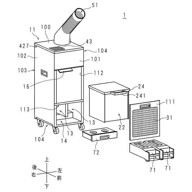 以下、実施の形態について、図面に基づいて説明する。図1は、実施形態1に係る空調機1の一構成例を示す模式的側断面図である。空調機1は、箱状の本体11を備え、当該本体11の底部に設けられたキャスターによって、例えば工場等の被空調空間の床面に載置される。本体11は、空調機1の外郭を成す筐体を含み、当該本体11には、後述する各種の部品が内装される。図1に示す空調機1の載置状態を、当該空調機1の通常の使用態様として上下左右を示す。なお、図1は、図2におけるA-A線による断面を、図2上にて左側から模式的に示したものである。