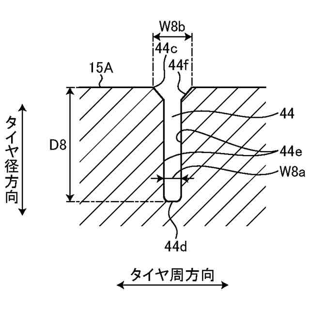 前記非貫通ラグ溝の最小の溝幅W8b、開口部の溝幅W8aが、0.2≦W8b/W8a≦0.5の関係を満たす、