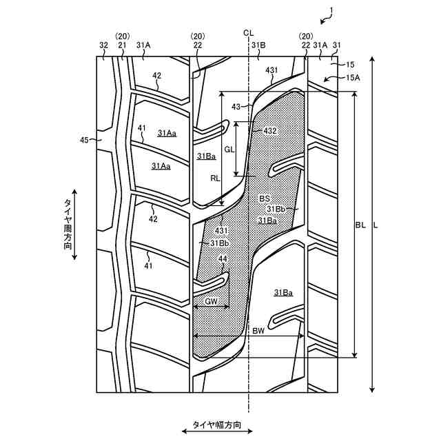 【解決手段】トレッド面15Aに、2本の周方向細溝22と、隣り合う各周方向細溝にそれぞれの端が連通して複数のセンターブロック31Baを区画する貫通センターラグ溝43と、を有し、貫通センターラグ溝は、隣り合うそれぞれの周方向細溝に一端が連通し接地時に溝壁同士が接触しない一対の非接触溝部431と、各非接触溝部431の他端を繋いて接地時に溝壁同士の少なくとも一部が接触する接触溝部432と、を含み、センターブロックは、他のセンターブロックとタイヤ幅方向で隣り合うラップ部を有しており、ブロック面積BSが、トレッド面15A全体のトレッド面積Sに対して、0.3[%]≦BS/S≦0.8[%]の関係を満たし、タイヤ周方向長BLが、タイヤ周長Lに対して、4.0[%]≦BL/L≦9.0[%]の関係を満たす。