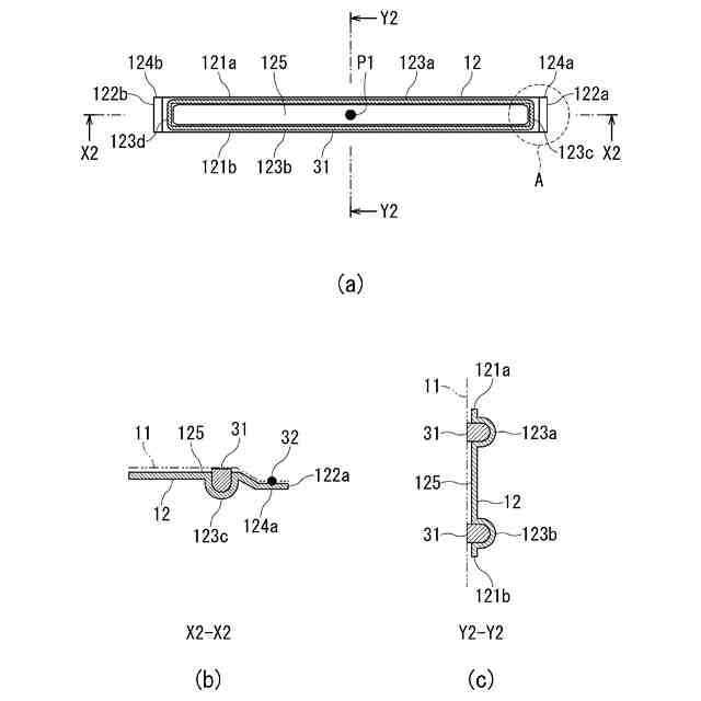 本発明の第2実施形態に係るルーフメンバの構成を示す(a)平面図、(b)X2-X2線による断面図および(c)Y2-Y2線による断面図である。
