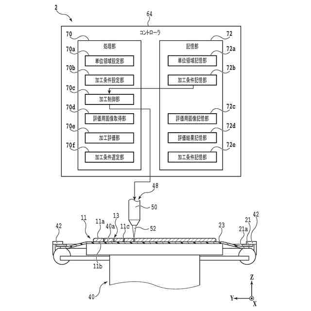 該加工制御部は、複数の該単位領域がそれぞれ異なる該加工条件で加工されるように該加工ユニットを制御し、
