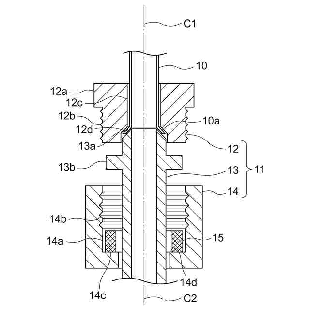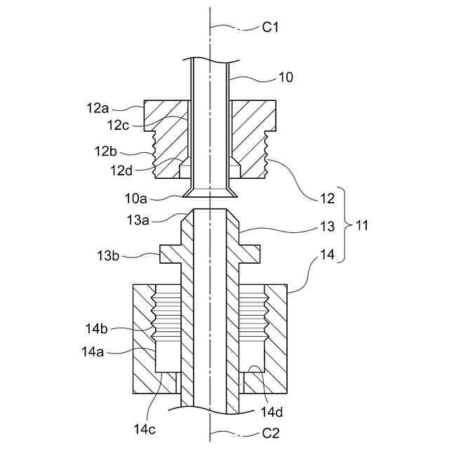 【解決手段】孔付きボルト12の第1貫通孔12cにフレア部10aが通されている。孔付きボルト12における第1貫通孔12cの開口の周縁部には、フレア凹部12dが設けられている。接続配管13の先端には、円錐面13aが設けられている。また、接続配管13の外周には、フランジ部13bが設けられている。接続配管13の第2貫通孔14aには、接続配管13が通されている。接続ナット14には、押付部14dが設けられている。押付部14dは、雌ねじ部14bが雄ねじ部12bにねじ込まれることにより、フランジ部13bを孔付きボルト12側へ押し付ける。