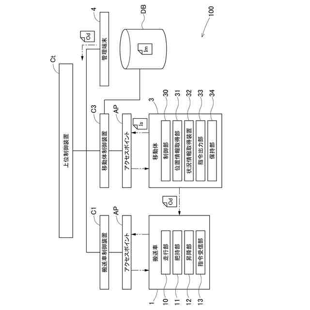 前記移動体は、前記搬送車に対する動作指令を出力する指令出力部を更に備え、