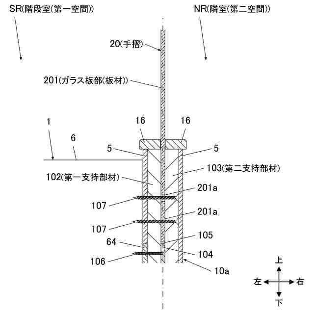 請求項1に記載の発明は、例えば図1~図32に示すように、第一空間(階段室SR)と第二空間(隣室NR)との間に立設される板材(ガラス板部201,21)を備えた手摺20の支持構造であって、